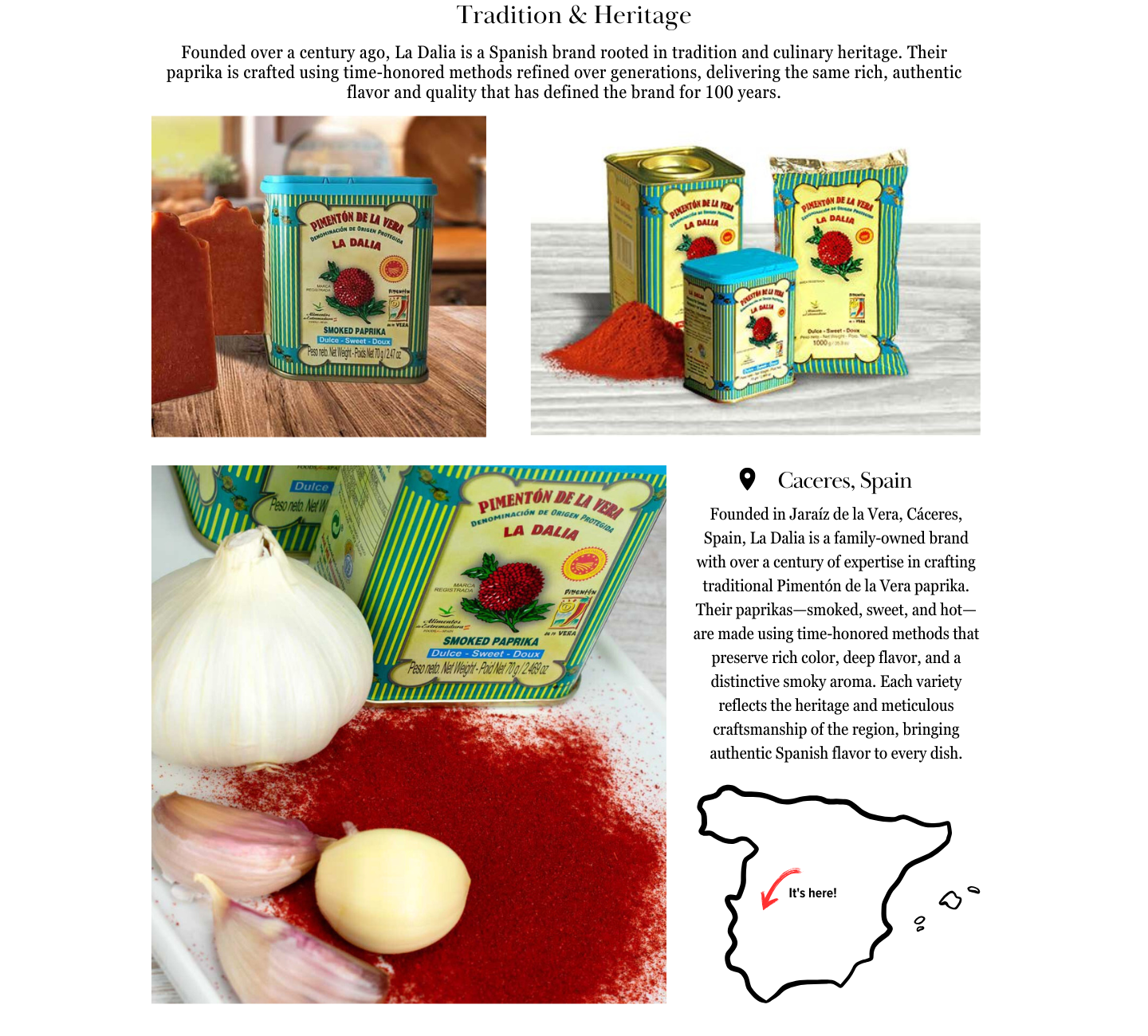 Made using traditional methods that date back 100 years, La Dalia takes tradition and quality seriously. Their paprika and is made using a process that has been refined, mastered, and advanced through technology, while still providing the same taste and quality as their paprika made 100 years ago. Whether you add a dash of their paprika to your favorite meat rub or incorporate it into a family favorite recipe, it will provide exhuberant flavor to every dish it touches.