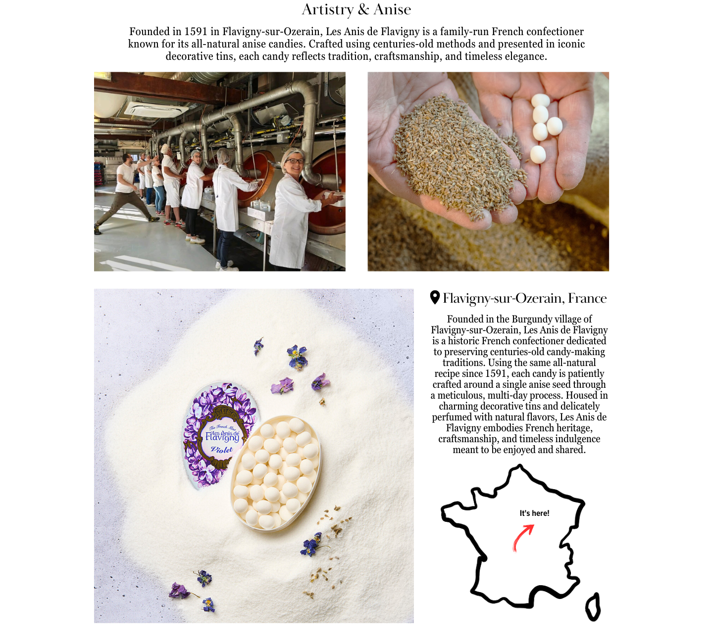Everything about Les Anis de Flavigny Mints, from the design of the tins to the candy itself, is steeped in tradition, folklore, and symbolism. This delicately flavored French candy is manufactured in the picturesque village of Flavigny, Burgundy, by a small family-owned company using the same recipe since 1591.