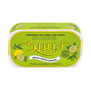 Nuri Sardines in Olive Oil with Lemon offers a bright, refreshing twist on traditional Portuguese sardines, hand-packed in premium olive oil with a hint of zesty lemon for a vibrant and balanced flavor. Sourced from wild-caught sardines and prepared using time-honored methods by Conservas Pinhais, each tender fish absorbs the subtle citrus notes that enhance the rich, natural taste of the sea.