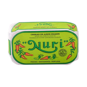 Nuri Spiced Mackerel in Olive Oil is a bold and flavorful take on Portuguese tinned fish, featuring wild-caught mackerel carefully preserved in high-quality olive oil with a vibrant spice blend. Infused with chili, cucumber, carrot, cloves, black pepper, and laurel, this spiced olive oil elevates the rich, tender mackerel with aromatic depth and a hint of heat.